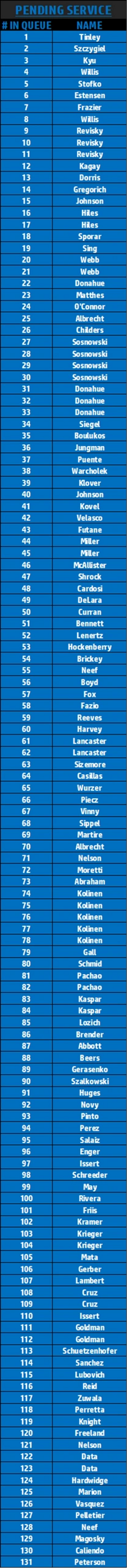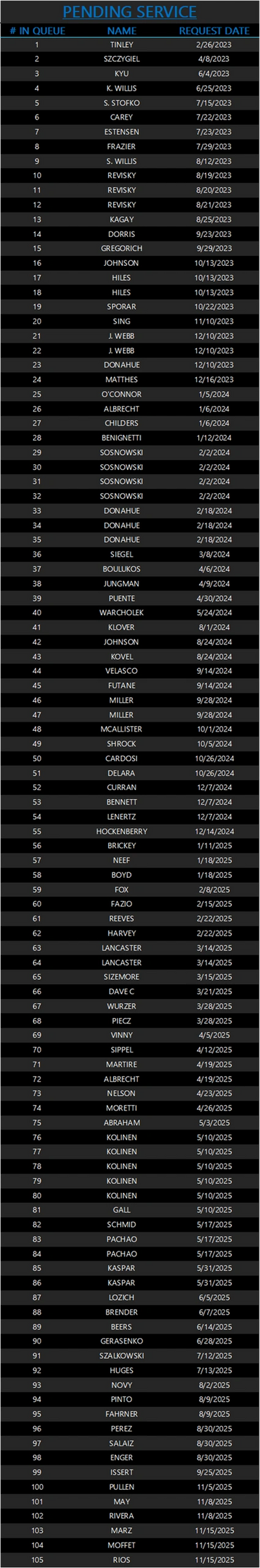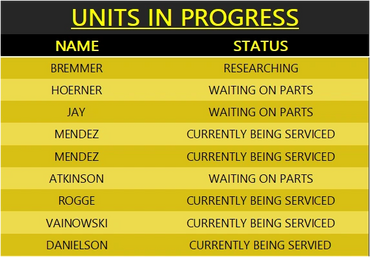 To better inform our customers, the lists below can be referenced to find your place in line for your unit to be serviced. It is typically updated every weekend.