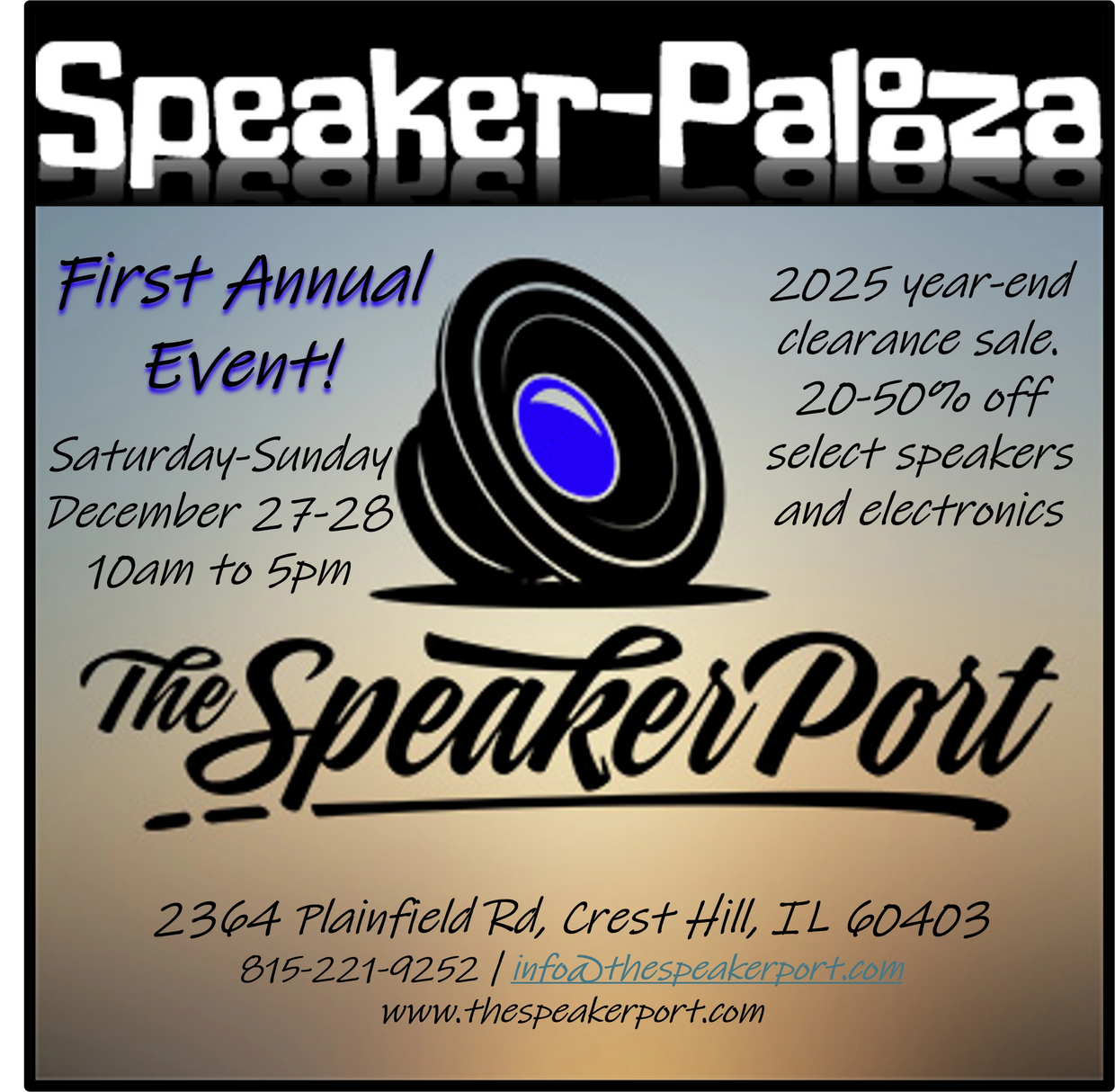 The Speaker Port is proud to present our first annual Speaker-Palooza event! Join us Saturday & Sunday, December 27-28, 10am-5pm.